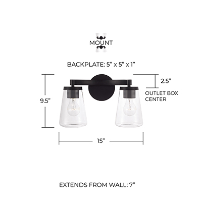 A graceful, curved arm and clear glass create the Aaron 2-Light Vanity for HomePlace. The tapered cylindrical shades bring refined style with optimal light output, while the Matte Black finish punctuates the classic silhouette. Also available in a 3-Light.