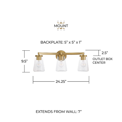 A graceful, curved arm and clear glass create the Aaron 3-Light Vanity for HomePlace. The tapered cylindrical shades bring refined style with optimal light output, while the Aged Brass finish adds elegance to the classic silhouette. Also available in a 2-Light.