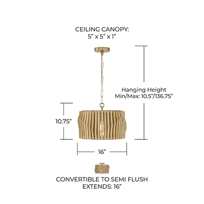 - • DETAILS: The carved slats of mango wood create an organic wave, complete with a touch of shine from the Brass finish. Artisan made and handcrafted; natural variation will occur. Can be hung as a pendant or semi-flush.
