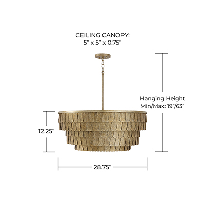 - • DETAILS: In a tiered drum silhouette, the curved metal dangling adornments create stunning dimension, accented beautifully by the heavy texture of the Ancestral Gold finish.