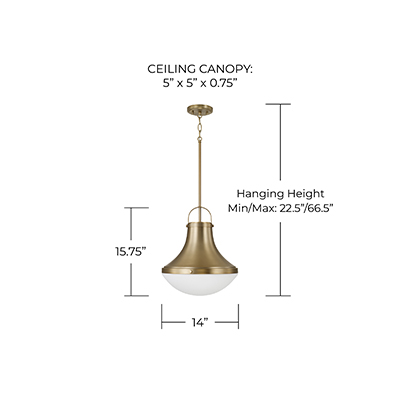 - • DETAILS: An Aged Brass finish and Soft White glass dome come together to form a flared drop silhouette, complete with subtle rivet details and oversized loop at the top.