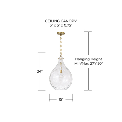 - • DETAILS: Clear Water glass creates compelling illumination in a teardrop silhouette, while the Aged Brass finish adds a classic touch.