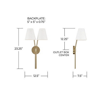 Seamlessly blending classic style with modern elements, the Cami Double Sconce brings mixed-metal elegance in a sleek silhouette. The tapered White metal shades sit atop the slender Aged Brass arms, creating a contemporary two-tone look.