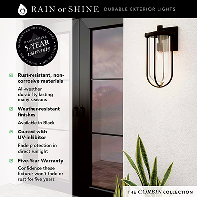 With a modern mix of industrial vibes and farmhouse flair, the Corbin 1-Light Outdoor Wall Mount gives any outdoor space an instant update. The Black finish accents the clean lines and oblong shape of the glass shades for a contemporary cool style. These fixtures are part of our Rain or Shine Collection and are backed by our five-year warranty.