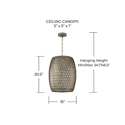 - • DIMENSIONS: 15in W x 20.5in H; Adjustable Hanging Height: 24in - 146.5in; Includes 120in Chain; 180in Wire