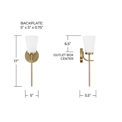 The Drake 1-Light Sconce for HomePlace brings clean and classic style to any space. Paired with a sleek, intersecting arm detail, the tapered Soft White glass shade creates an ambient glow, finished in Aged Brass for sophisticated style.