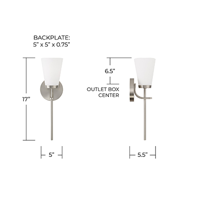 The Drake 1-Light Sconce for HomePlace brings clean and classic style to any space. Paired with a sleek, intersecting arm detail, the tapered Soft White glass shades create an ambient glow, finished in Brushed Nickel for versatile style.