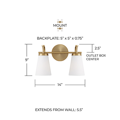 The Drake 2-Light Vanity for HomePlace brings clean and classic style to any space. Paired with sleek, intersecting arms, the tapered Soft White glass shades create an ambient glow, finished in Aged Brass for sophisticated style.