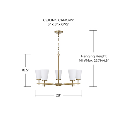 The Drake 5-Light Small Chandelier for HomePlace brings clean and classic style to any space. Paired with sleek, intersecting arms, the tapered Soft White glass shades create an ambient glow, finished in Aged Brass for sophisticated style.