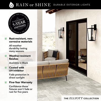 The tapered silhouette, illuminated glass cylinder, and simple loop detail create the Elliott Large Wall Lantern. The elongated form and Black finish bring sleek style to any exterior space. Part of our Rain or Shine Collection and backed by our five-year warranty against rust and fading.