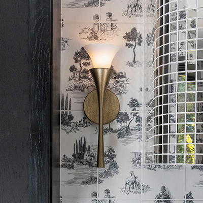 The Nola Sconce is a uniquely stunning luminaire in a classic candlesleeve design with a modern twist. Nestled into the flared silhouette, the Soft White glass detail casts a warm ambient glow against the rich, amber shimmer of the Mystic Luster finish.