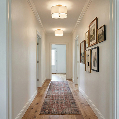 This scalloped, white shaded semi-flush is adorned with a frosted acrylic diffuser and brushed gold finial. The sweet and soft design is great for powder rooms, hallways and kids rooms.