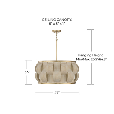 The Willa Large Pendant artfully brings the outdoors in. Artisan crafted pieces of Bleached mango wood create alternating curves on the drum silhouette, giving glimpses of illumination from within. The Matte Brass finish offers a warm shine, bringing a beautiful balance to this unique, structural luminaire.